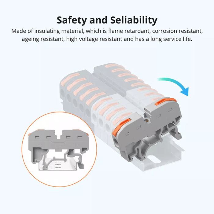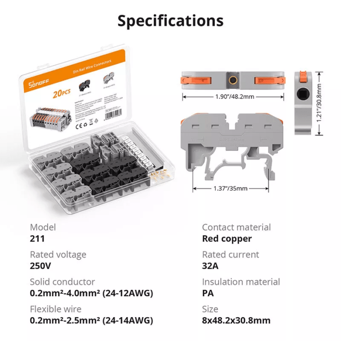 O kit de conectores Sonoff 211 foi desenvolvido para oferecer praticidade, segurança e organização em instalações elétricas. Compatível com trilho DIN padrão de 35 mm, é ideal para quadros de distribuição, automação residencial e aplicações industriais leves.